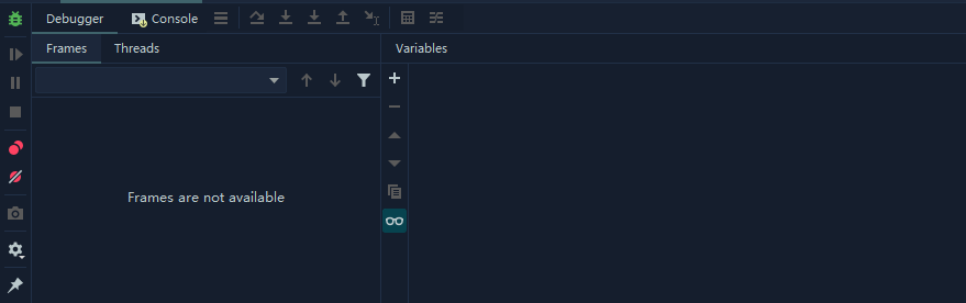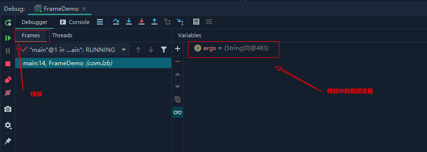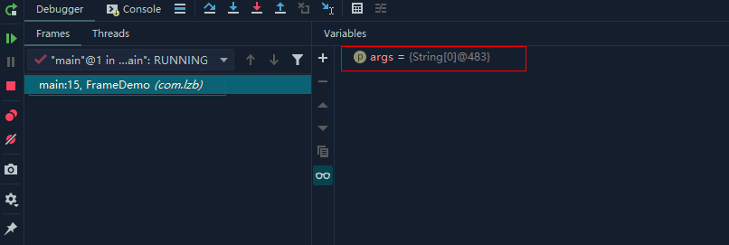 初始执行的是main方法,main方法的参数是一String数组,参数名称为args,此时可以看到Variables变量表中有一个args={String[0]@483},数组对象的大小为0,因为我们并未设置启动相关参数。