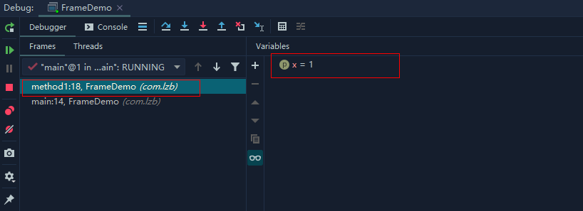 F7步进(Step into)进入method1,此时线程栈栈帧表Frames中有两个栈帧,method1的栈帧中有一个局部变量x,这个变量时从main方法中传递过来的。