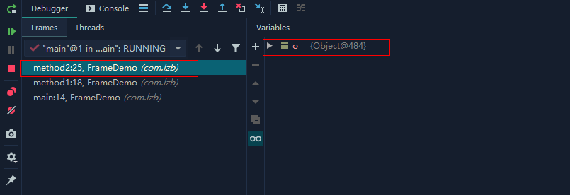 F7步进(Step into)进入method2,此时线程栈栈帧表Frames中有三个栈帧,method2的栈帧中有一个局部变量o,这个局部变量时在method2中实例化的Object对象