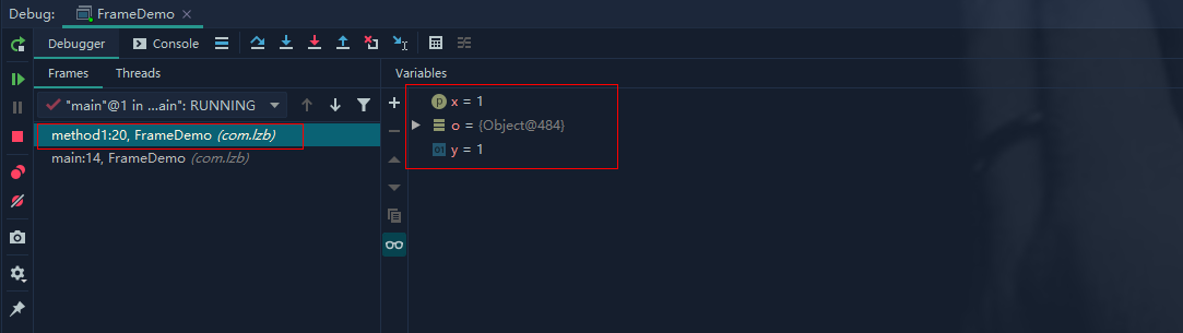 F7步进(Step into)method2结束,此时Frames中只有method1和main方法两个栈帧,method2方法由于运行结束方法返回后,就会弹栈(出栈)。继续F7步进(Step into)到System.out.println(y);可以看到如下局部变量表,新增了o和y。