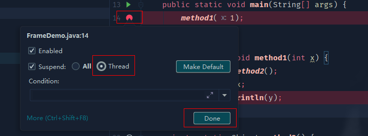 其实上述的过程就是DEBUG一个线程在虚拟机栈中分配的栈内存中栈帧的出入栈情况。当时大多数情况下,方法调用情况和内部逻辑会比上述情况复杂的多,并且会有多线程的场景,在多线程情况下需要将断点设置成Thread模式。右键单击断点,选择Thread -> Done即可。