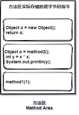 方法区是虚拟机中一块线程共享的内存区域,用于存储类信息、常量池、静态变量、编译后的字节码等信息。在我们这个例子中,JVM层面执行的是字节码指令,而这些指令就是存储在方法区中。