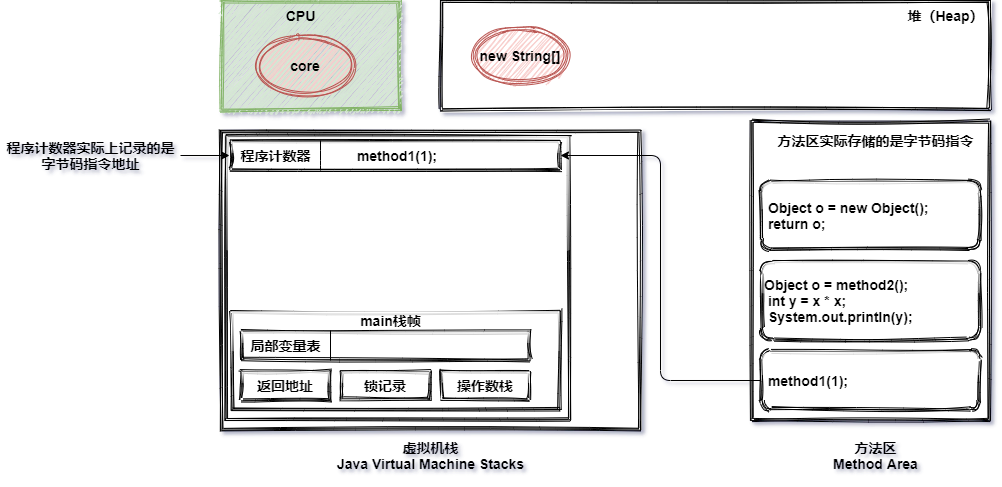 main函数中只有一句代码,调用了method1函数,此时程序计数器指向该方法(实际上指向的是JVM字节码指令的地址),并且此时main线程栈中会压入一个method1函数栈帧,method1函数中有三个局部变量,分别是x、o、y,此时只有x的值由方法传递已知,因此x=1;除此之外method1栈帧的返回地址指向方法区中method1
