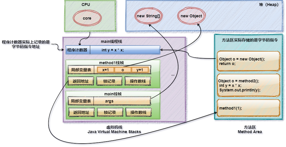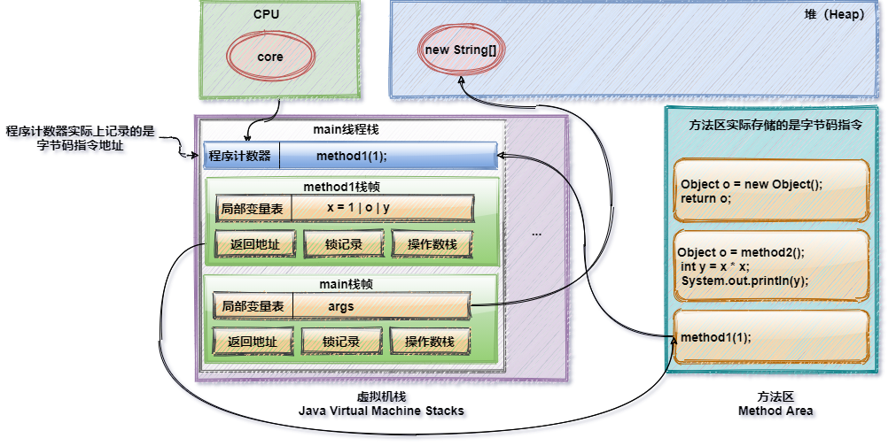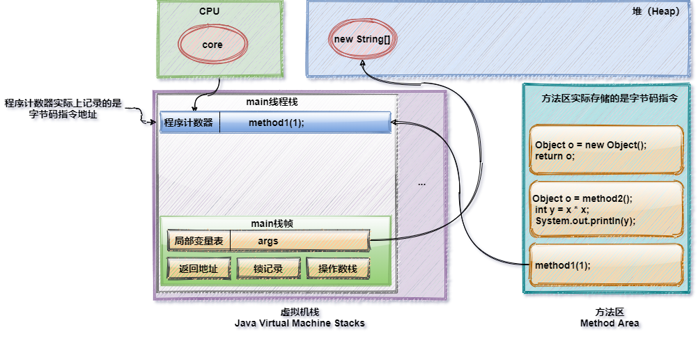 图解方法调用时栈帧的变化,涉及到JVM层面的知识点,其中包括方法区、堆、虚拟机栈、栈帧、程序计数器,其大致作用如下所示: