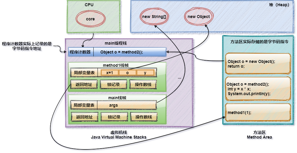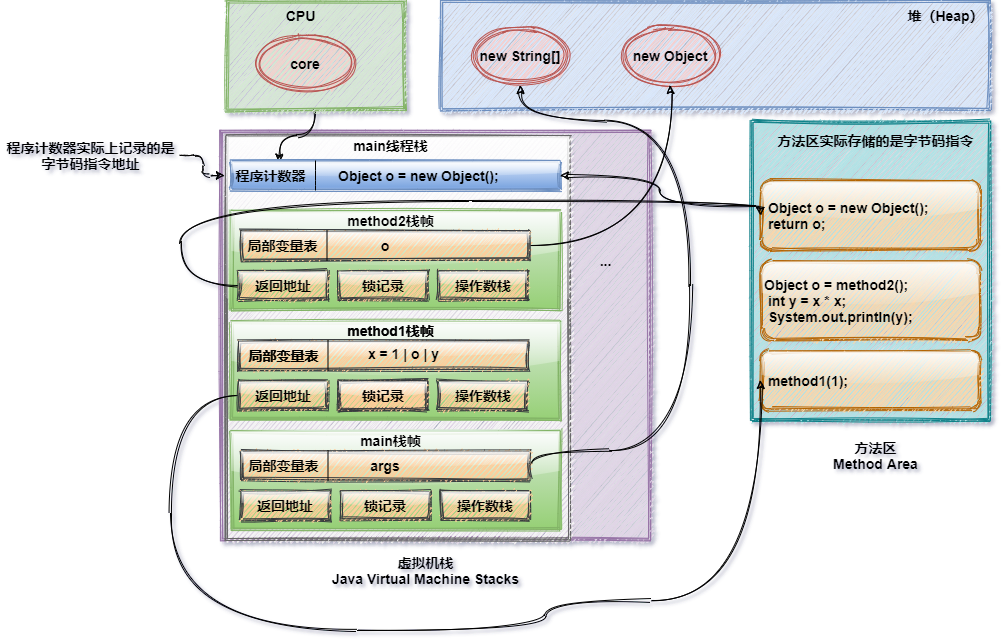 method2执行结束后,main线程栈中method2栈帧会弹出,此时method1局部变量表中的局部变量o接收method2栈帧中返回地址指向的返回值