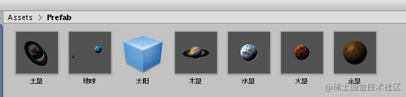 首先我们需要行星【土星/地球/木星/水星/火星/金星/月球】素材。我已经做成了【预制体】,源码项目中直接使用。