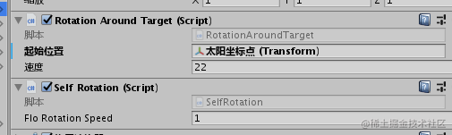 并且每个都挂载上两个脚本【RotationAroundTarget】和【SelfRotation】