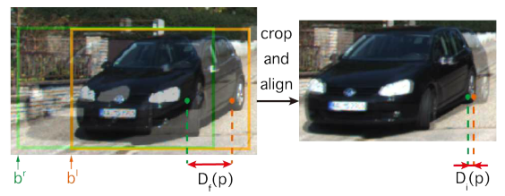 其中, b l b^l bl 和 b r b^r br 分别表示两个视图中边界框的左边界坐标。我们的目标本质上是了解每个属于感兴趣对象 p 的实例差异 D i ( p ) D_i(p) Di(p)而不是 D f ( p ) D_f(p) Df(p)。这种裁剪和对齐的过程如下图所示。