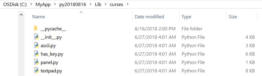 然而查看Windows系统里python安装文件,发现在Lib文件夹里确实有一个名为curses的子文件夹,里面也存放了curses库对应的实现,为什么还是会报找不到_curses这个mobule的错误消息呢?