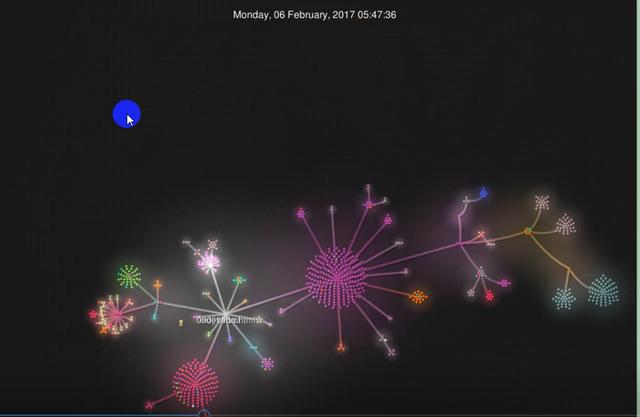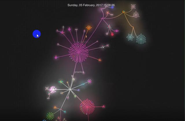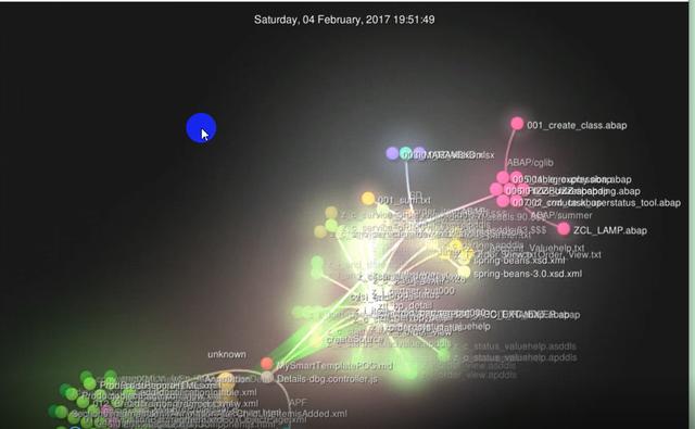 Gource会从指定的github仓库创建那一刻开始(大家看我下面截图的2017年2月4日就是我github仓库的创建时间),以视频的方式显示每次提交的明细。每次提交增加或删除的文件会以不同颜色的小圆圈代表,文件名也能显示出来。
