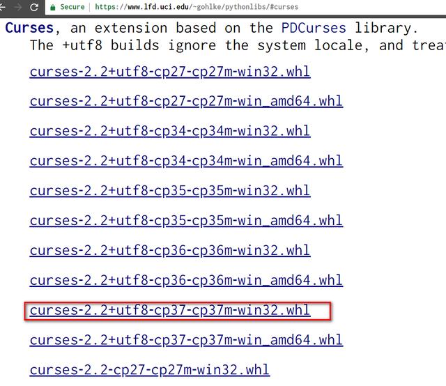 下载和您的python版本对应的curse库。对于我来说,因为我的python版本是3.7.0, 因此需要下载curses-2.2+utf8-cp37-cp37m-win32.whl.