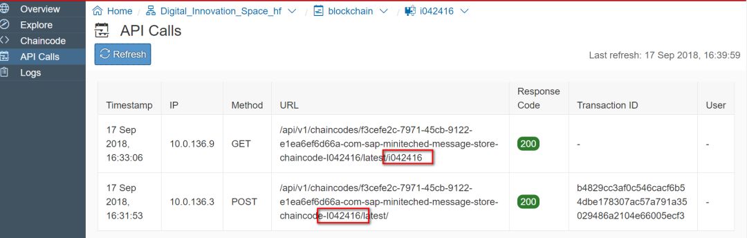 在超级账本控制台的API Calls和Logs面板里也能看到每次超级账本读写的详细信息。