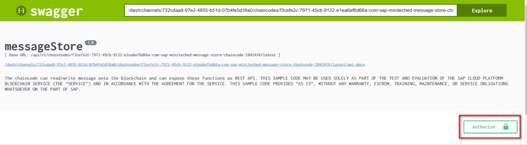该控制台集成了Swagger框架,在调用post请求进行超级账本的写操作和get请求进行读操作之前,先要点击Authorize按钮进行身份认证:
