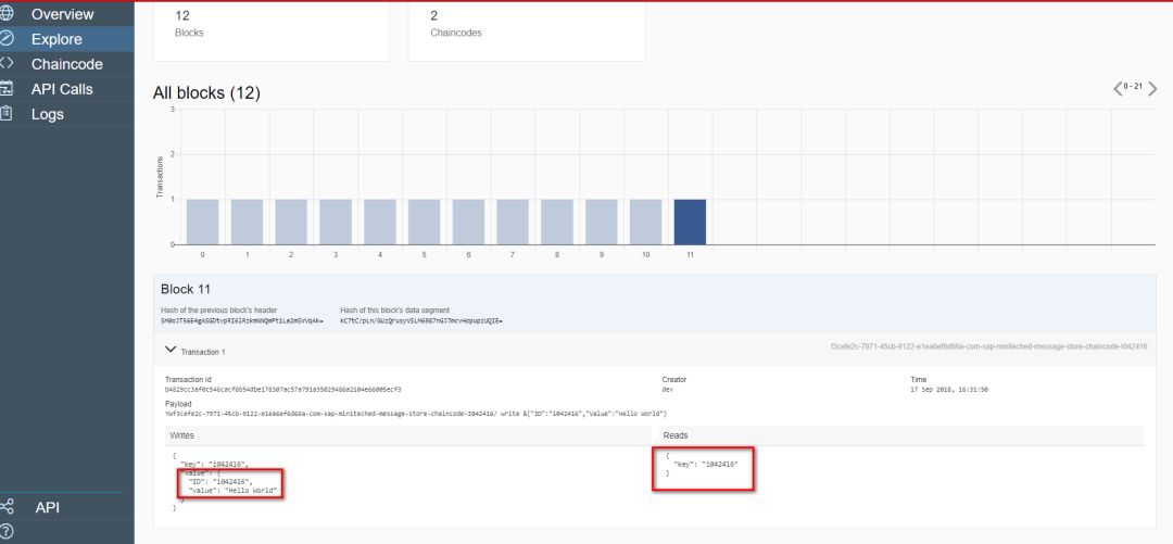 登录SAP云平台超级账本控制台,能看到之前通过post写入的数据已经加入到区块链尾部的区块了。点击区块可以查看数据明细:
