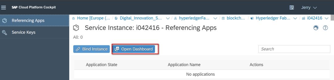 点击Service实例的Referencing Apps面板,点击按钮Open Dashboard: