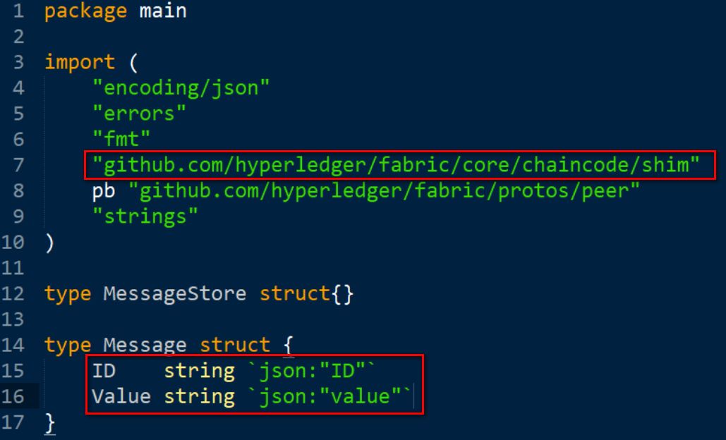 我们使用import将这个shim接口的依赖引入进来,在第14行定义一个结构体,包含ID和Value两个字段。这个结构体即是待写入超级账本的数据结构,ABAP顾问可以将其视为ABAP数据字典里定义的结构体。