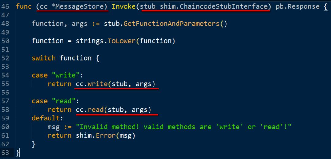 第46行定义的方法Invoke是这个最简单的智能合约的核心代码,cc *MessageStore这个语法和C语言很像,定义了一个类型为MessageStore的指针变量cc。这个指针变量同C++的this指针和ABAP的me引用作用类似,在方法被调用时,指向了方法的调用者。