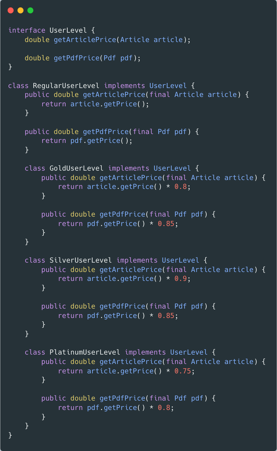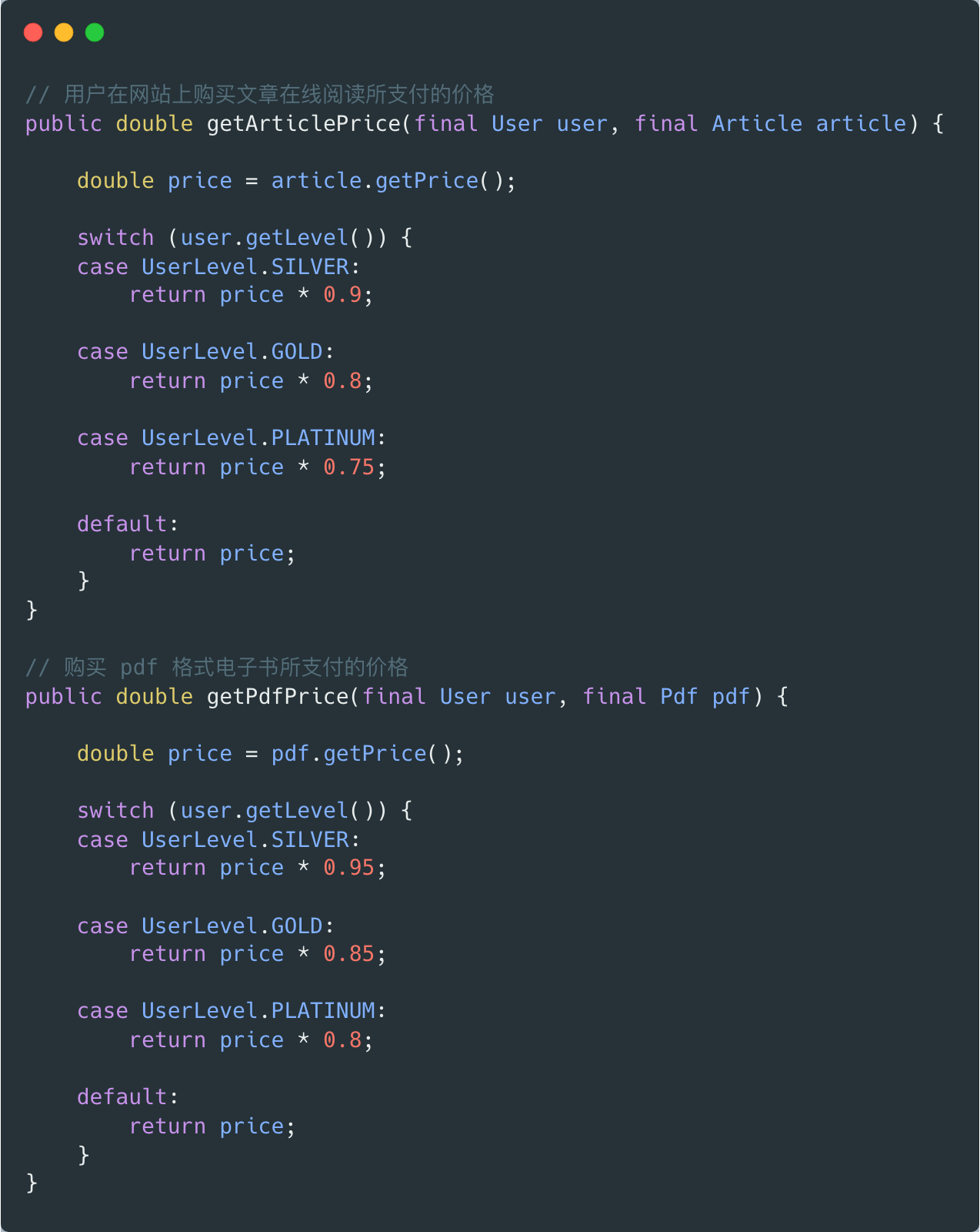 这并非仅有的根据用户级别进行判断的代码,各种需区分用户级别场景都有类似代码,而这也是一种典型的坏味道:重复switch(Repeated Switch),通常都是因为缺少一个模型。