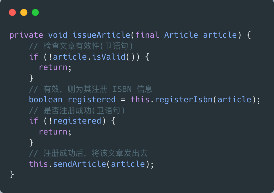 这样的代码可使用卫语句(guard clause),即设置单独检查条件,不满足该检查条件时,方法立刻返回。