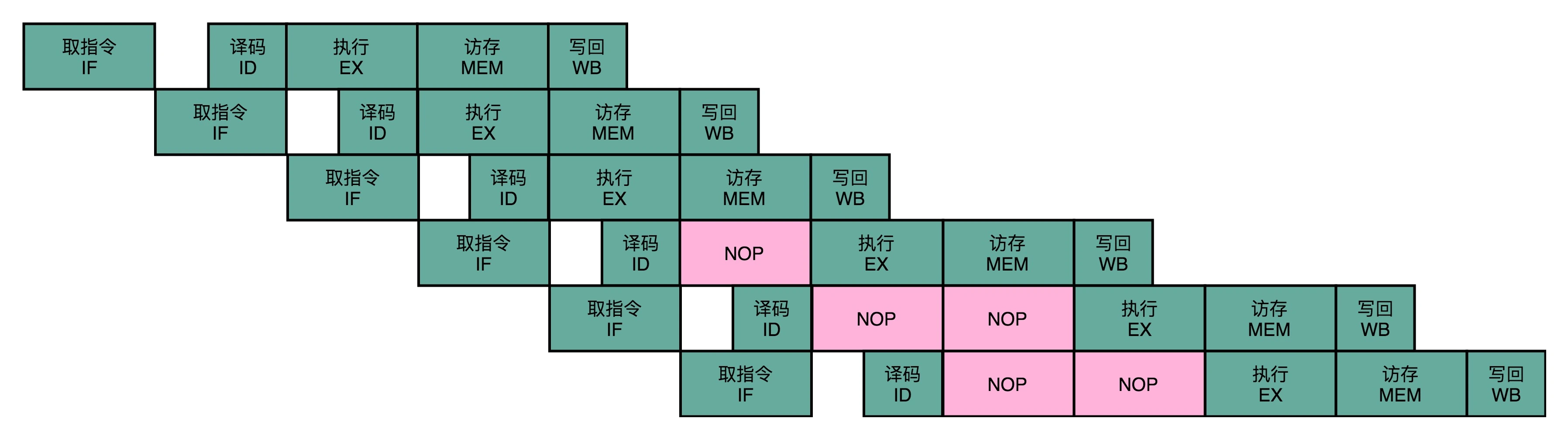 所以,实际上并非让流水线真停下来,而是在执行后续操作步骤前,插入一个NOP操作,即执行一个只负责摸鱼的操作。