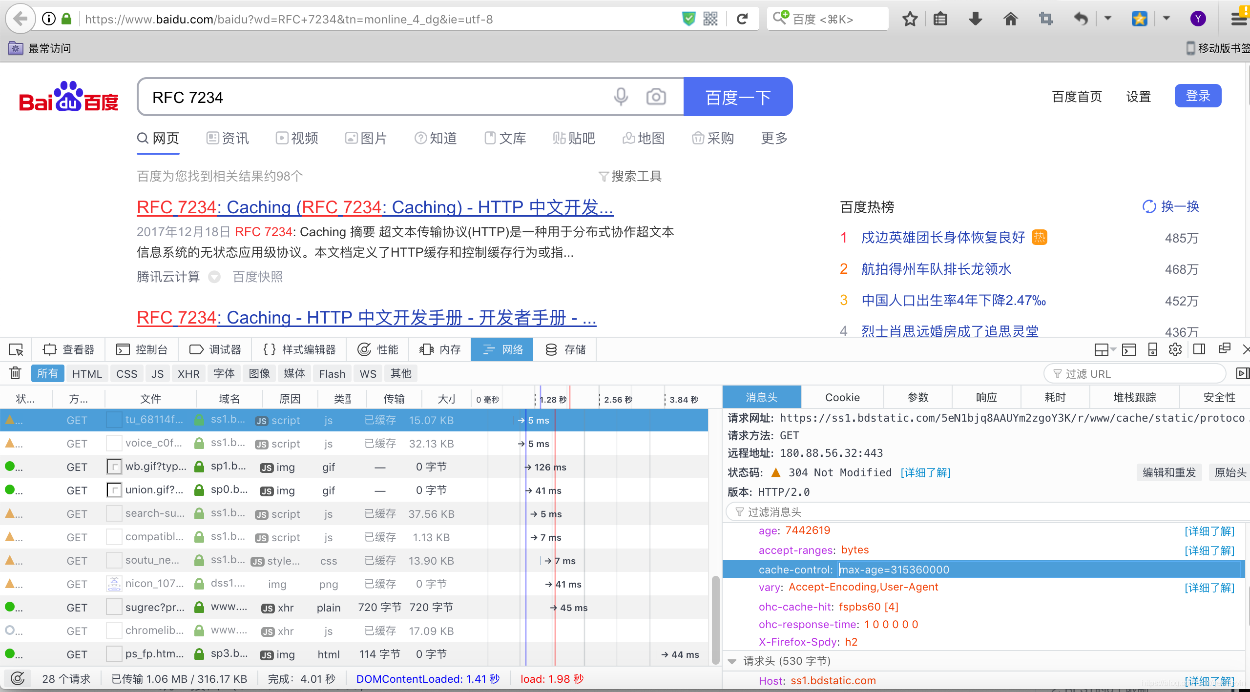 举个例子,我们进入百度搜索RFC 7234(http协议关于缓存的标准)可以看到“消息头”里面关于缓存的设置,百度把一些不经常变化的资源标记了很大值,告诉火狐浏览器,下次不需要重新下载该资源。