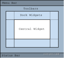 QMainWindow类为应用程序提供了一个主要窗口。QMainWindow提供了构建用户应用程序界面的框架,它由Menu Bar(菜单栏)、ToolBars(工具栏)、Dock Widget(描接窗口)、Central Widget(中心窗口)、Status Bar(状态栏)组成,如下图所示: