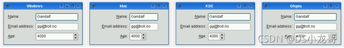 QFormLayout类通过管理输入控件和他们相关联的标签实现布局。 QFormLayout将控件分成两列布局,左栏包括标签,右列则是输入控件(QLineEdit,QSpinBox等)。 QFormLayout表单布局器的规律性、限制性比网格布局器更强,是严格的两列布局。传统上,这样的两栏式布局形式一般采用QGridLayout实现。 QFormLayout是更高级别的替代方案,提供了以下优点: