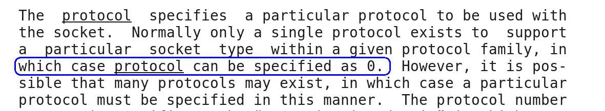 int protocol:指定通信协议类型。Type参数已经指定了协议,该参数直接填0即可!