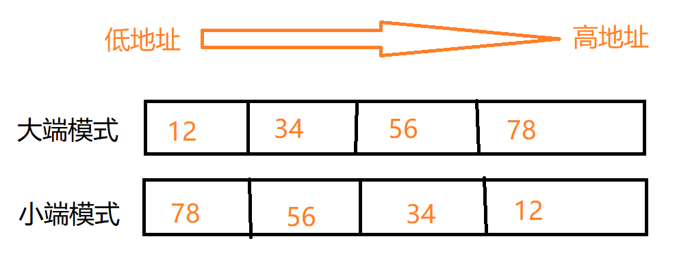 大端模式(Big-endian),是指数据的高字节,保存在内存的低地址中,而数据的低字节,保存在内存的高地址中。