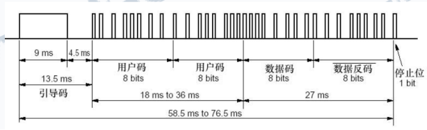 NEC协议的数据格式包括了引导码、用户码、用户码反码、按键码、按键反码。