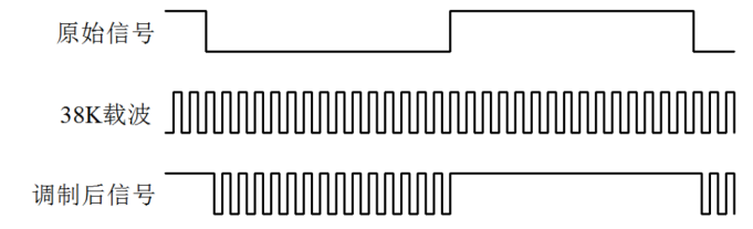 NEC协议,通常是使用 38K左右的载波进行调制,再发送的;这里的调制就是用待传送信号去控制某个高频信号的幅度、相位、频率等参量变化的过程,即用一个信号去装载另一个信号。比如:我们的红外遥控信号要发送的时候,先经过 38K 调制。