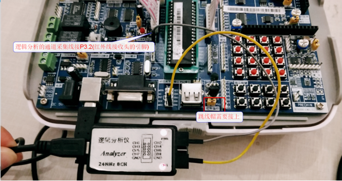 实验板上的红外线接收头是接在单片机的P3.2 IO口上,要使用红外线接收功能,需要将红外线接收头的跳线帽接上。