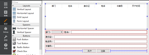 最上面一行是使用的tableWidget控件,显示部分使用标签控件,输入部分使用单行编辑器,最后一行添加了两个按钮,用于开户和注销操作。以上的每一行都是使用水平布局方式,整个Widget窗口采用了垂直布局方式。