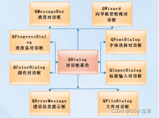 对话框在应用程序很常见,对话框没有最大化按钮、没有最小化按钮、基本上不能改变移动形状大小。QT提供了一些内置的标准对话框,标准对话框的基类为QDialog。继承关系如下图: