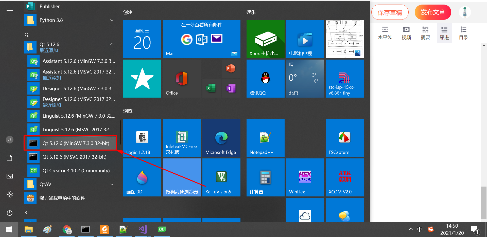 第二步: 按下键盘上的windows按钮,打开窗口列表,找到QT安装的位置(按字母排序的Q),选择当前QT程序编译时使用的编译器,打开命令行终端。