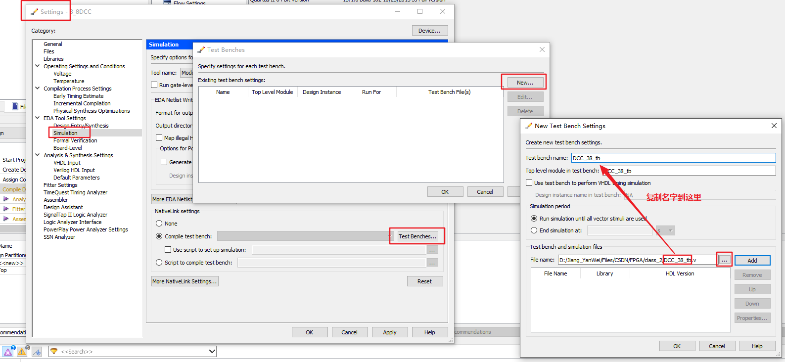 3、把上面工程编译一遍没错之后,就可以开始写tb(testbench)文件了,再新建一个DCC_38_tb.v文件,编写激励程序。