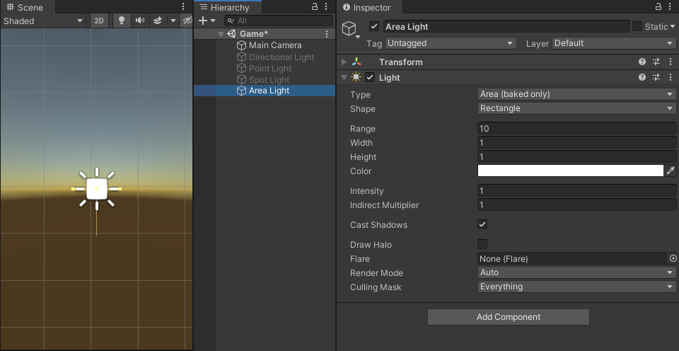 区域光是通过空间中的矩形来定义的。光线在表面区域上均匀地向所有方向上发射,但仅从矩形的所在的面发射。无法手动控制面光源的范围,但是当远离光源时,强度将按照距离的平方呈反比衰减。由于光照计算对处理器性能消耗较大,因此面光源不可实时处理,只能烘焙到光照贴图中。