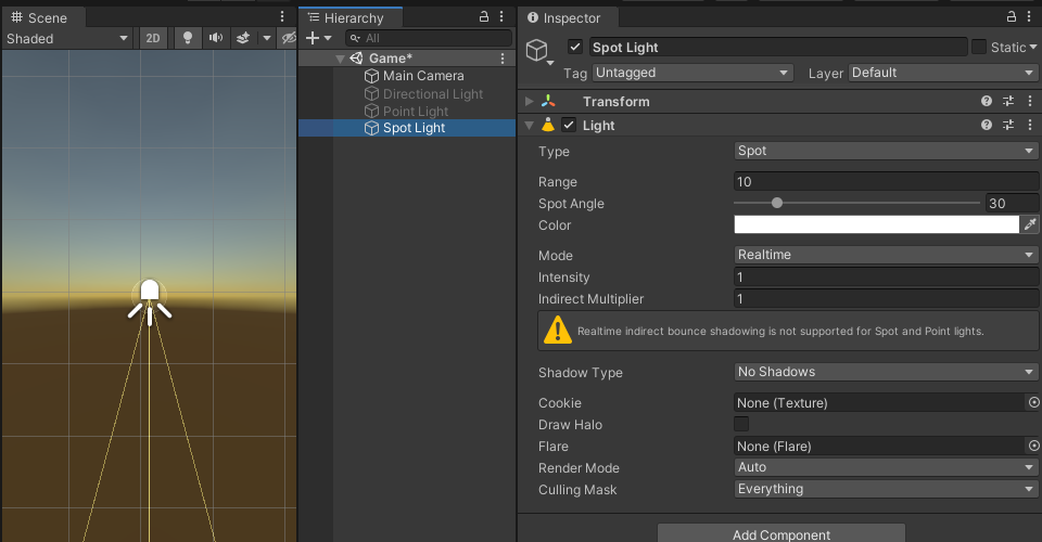 聚光灯通常用于人造光源,例如手电筒、汽车前照灯和探照灯。通过脚本或动画控制方向,移动的聚光灯将照亮场景的一小块区域并产生舞台风格的光照效果。
