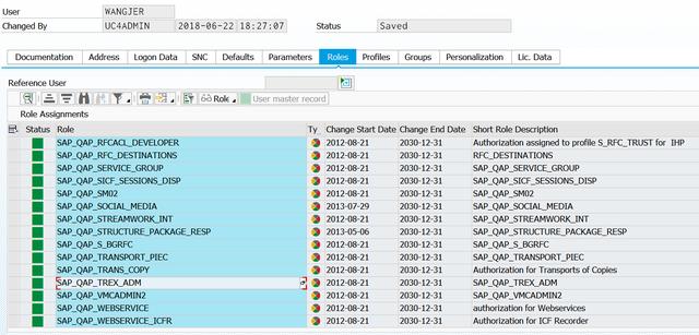 然后在事务码SU01里将多个角色分配给用户: