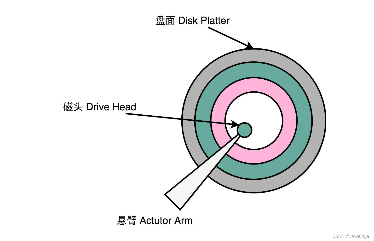 悬臂链接在磁头上,并且在一定范围内会去把磁头定位到盘面的某个特定的磁道(Track)。