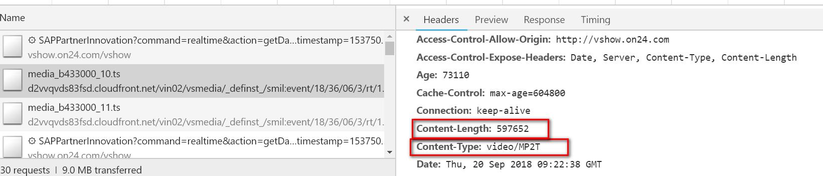 随便看一个请求的响应,发现类型为video,大小为500多k。因此,这个在线视频被拆分成了若干500多k的小片段,然后通过浏览器下载到本地进行播放。