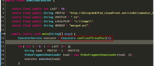 2. 使用JDK自带的多线程库 ExecutorService多线程下载这些片段。ExecutorService实际是一个线程池。第15行可以指定线程池里工作线程(Working thread)的个数。