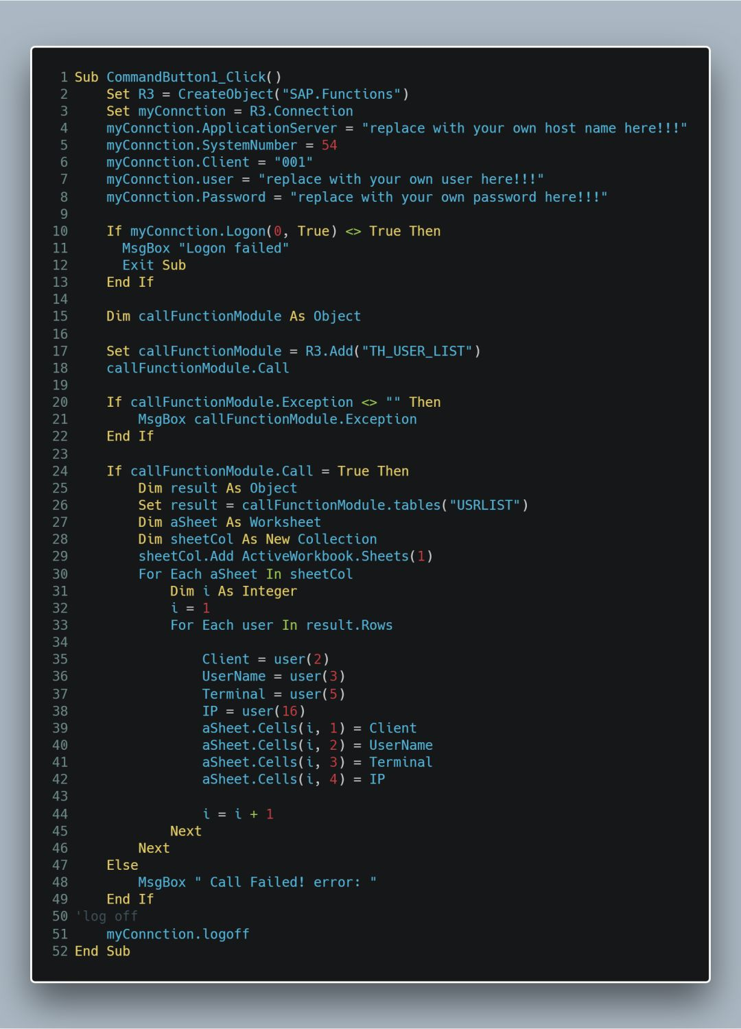 很快我的懒癌又犯了,因为我在这些系统上并不会进行开发工作,那么有没有办法不用SAPGUI登录系统,也能执行事务码并查看结果呢?有,用excel。在excel里做几个按钮,每个按钮的事件处理函数用VB硬编码成对应系统的地址,系统编号,用户名和密码,以及期望执行的函数或者事务码的名称。