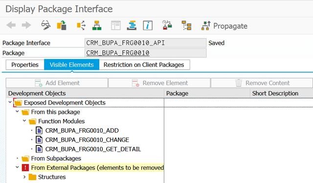 事务码SE21创建ABAP包接口。这是ABAP基于包层面的访问控制实现逻辑。包里可以存储很多ABAP对象。如果开发人员想将某些对象声明为包外程序也能访问,可以将这些对象放在包接口的Visible Elements标签页下面。