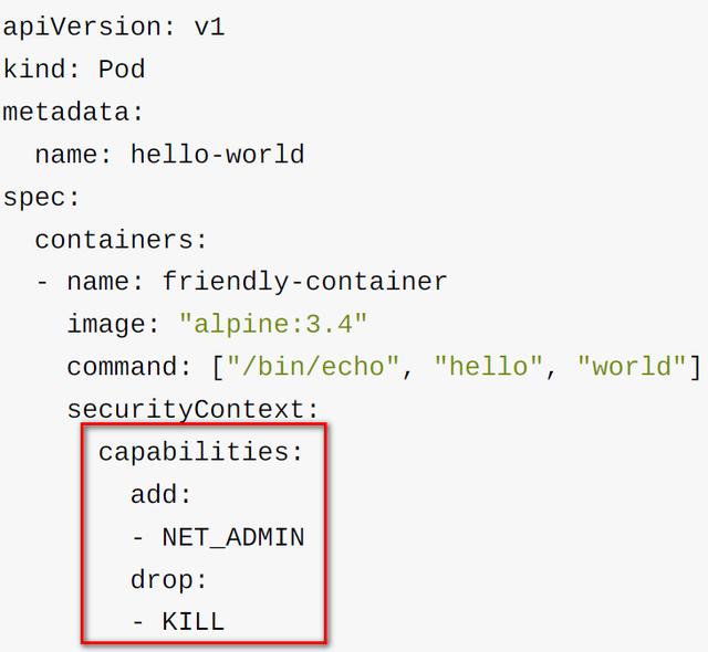 Kubernetes提供了修改Capabilities的机制,可以按需要给给容器增加或删除。比如下面的配置给容器增加了 CAP_NET_ADMIN 并删除了 CAP_KILL: