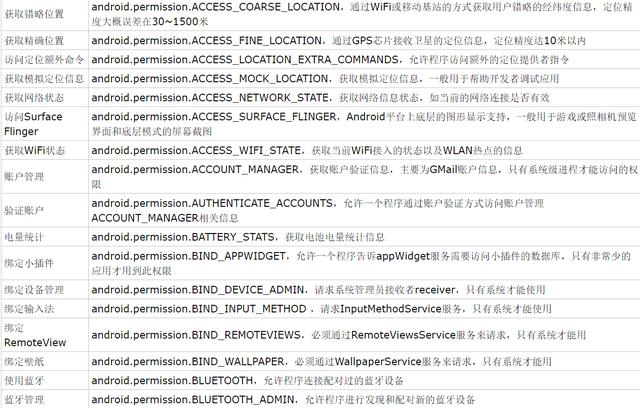 - 描述了应用程序使用某些受保护的程序API或和其它应用程序交互所需的权限。