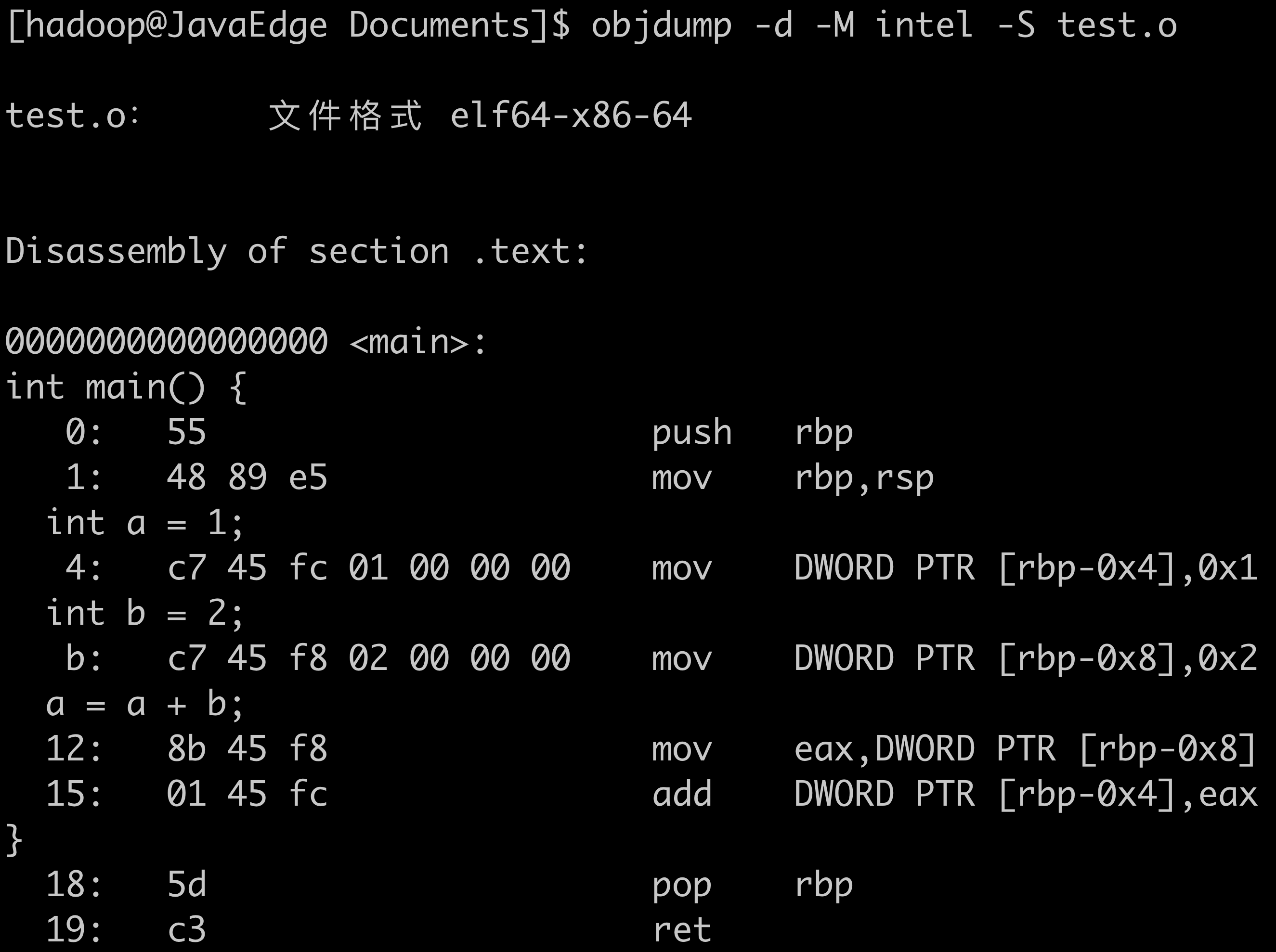了解了这个过程,下面我们放大局部,来看看这一行行的汇编代码和机器指令,到底是什么意思。