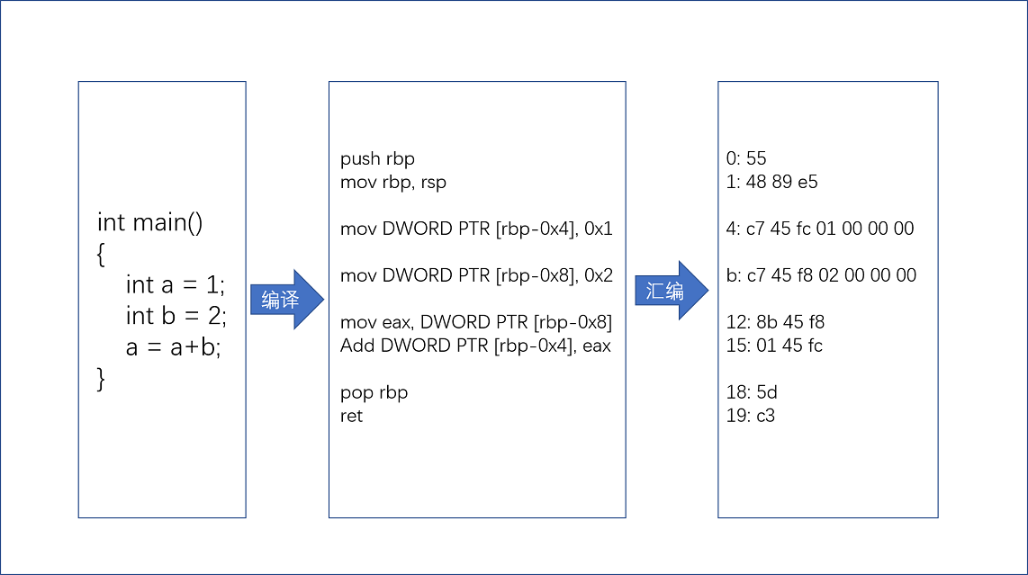 从高级语言到汇编代码,再到机器码,就是一个日常开发程序,最终变成了CPU可以执行的计算机指令的过程。