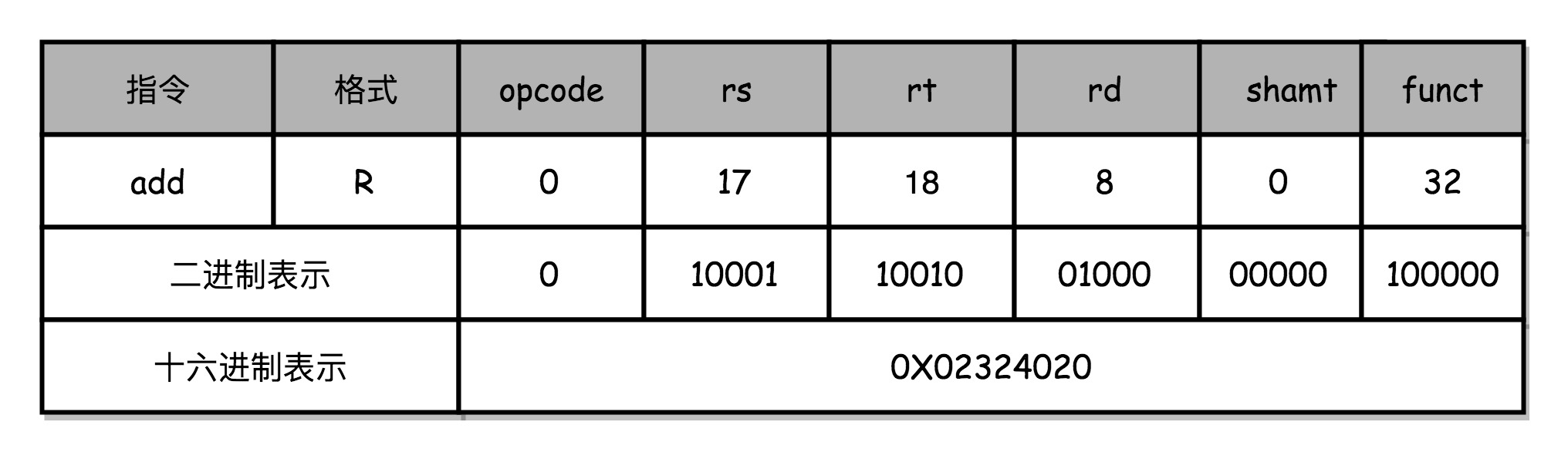 一般把对应的二进制数,用16进制表示。这里0X02324020。这个数字也就是这条指令对应的机器码。