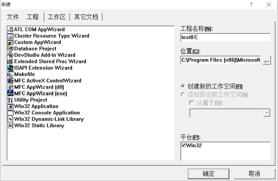 首先创建MFC项目,选择"MFC AppWizard"工程,命名为"test01"。